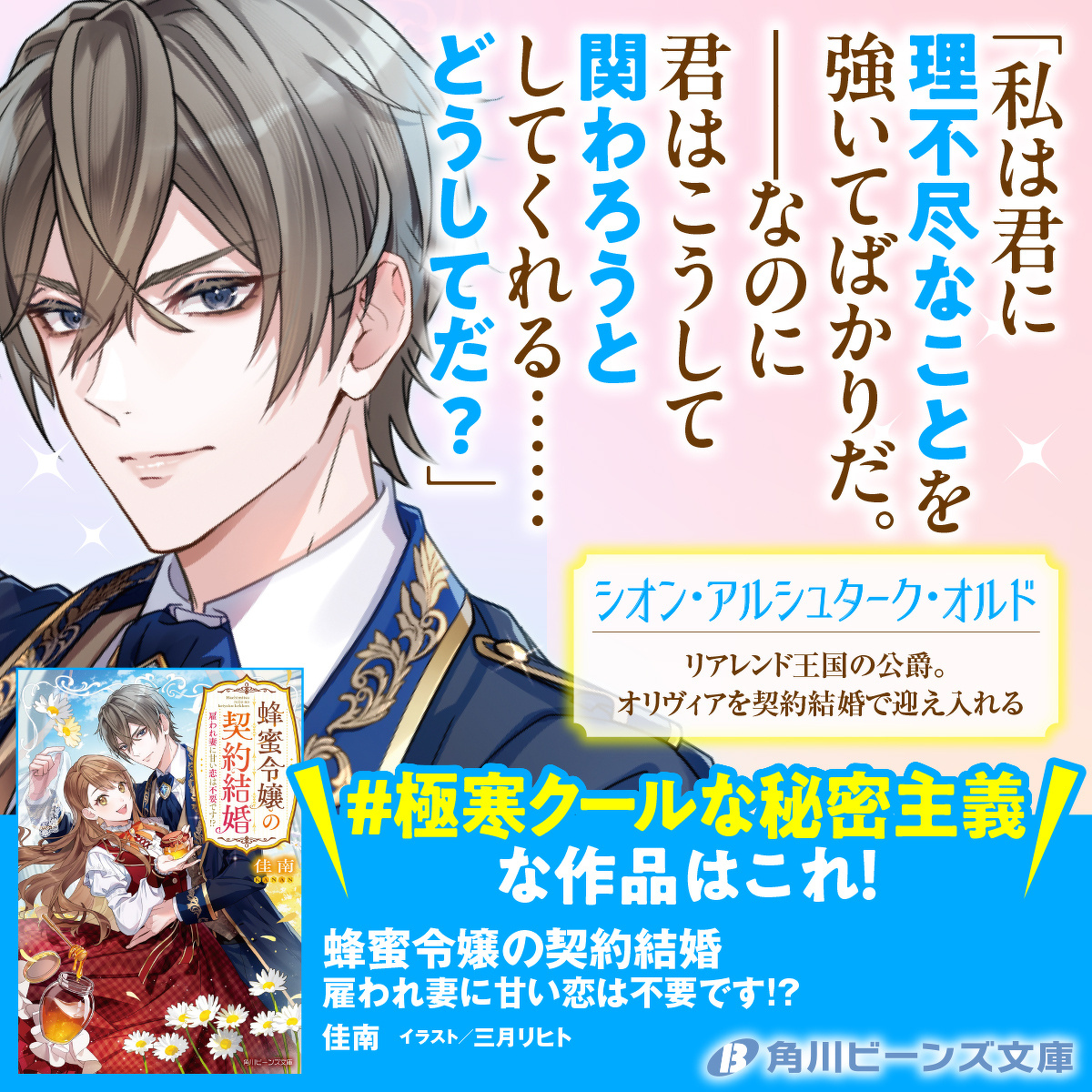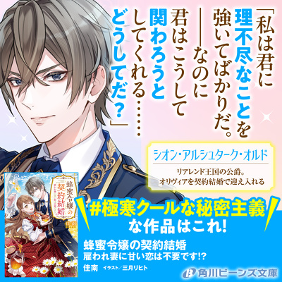 2025年9月刊『蜂蜜令嬢の契約結婚 雇われ妻に甘い恋は不要です!?』の発売を記念して、第22回角川ビーンズ小説大賞受賞作4作品の記念キャンペーンを角川ビーンズ文庫公式Xにて本日よりスタートします!